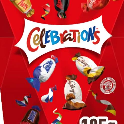 Celebrations is a chocolate selection box made by Mars Confectionary which is made up of Mini Bounty, Mars, Milky Way, Galaxy, Malteser, Galaxy Caramel, Topic, Galaxy Truffle and Snickers.